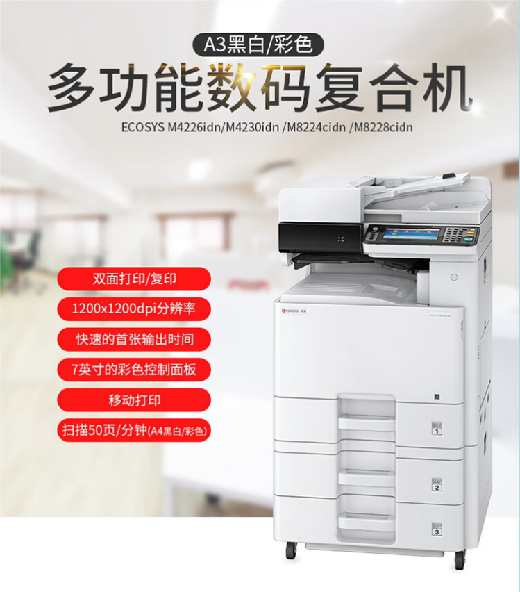 京瓷M4226idn 黑白激光 打印26頁/分鐘 復印 掃描 自動輸稿器 有線網(wǎng)絡 落地紙盒 30萬頁硒鼓壽命 支持國產(chǎn)系統(tǒng)